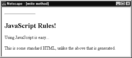 displays output in the Navigator. "Big deal," you say, "HTML already does that." But in a script you can do all kinds of things you can't do with ordinary HTML. For example, you can display text conditionally or based on variable arguments. For these reasons, write