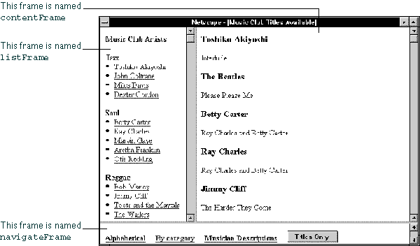 , contains hypertext links the user can click to choose how the musicians are displayed in listFrame